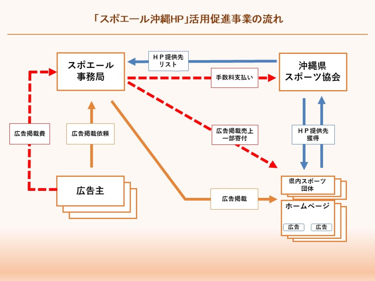 弊社が運営する沖縄のアマチュアスポーツを応援するプロジェクト「スポエール沖縄」で県内スポーツ団体にホームページを無償で提供し、掲載する企業・ 団体の広告掲載売上の一部を県内スポーツ 団体に寄付・備品提供を行います。公益財団法人沖縄県スポーツ協会はホームページ提供先団体の獲得を担い、その手数料として広告掲載費の5%を受取り、各種事業に活用します 。